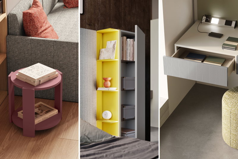 mensole, librerie e complementi per l’home office, letti, comodini e comò, armadi ad ante battenti o scorrevoli e cabine armadio.